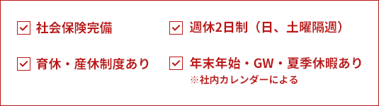 休日休暇 | 週休2日制(日、土曜隔週)/年末年始・GW・夏季休暇あり ※社内カレンダーによる ※希望休の取得可(要相談) |